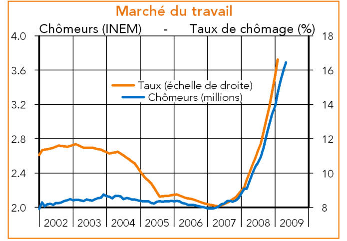 La récession dans laquelle est plongée l'Espagne depuis fin 2008 s'est aggravée au premier trimestre 2009. Le PIB espagnol s'est replié de 7,4% en rythme annualisé.