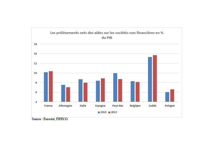 Les entreprises françaises sont-elles particulièrement aidées sachant qu'elles supportent un niveau élevé de prélèvements ? Une note de Fipeco compare la situation des entreprises en France et dans les autres pays européens, en termes de prélèvements nets des aides publiques qui leur sont versées. La comparaison est effectuée sur la base des données d'Eurostat, pour 2022, en prenant comme année de référence 2019, plus représentative des écarts structurels entre les pays, les années 2020 et 2021 ayant été marquées par des aides exceptionnelles importantes.