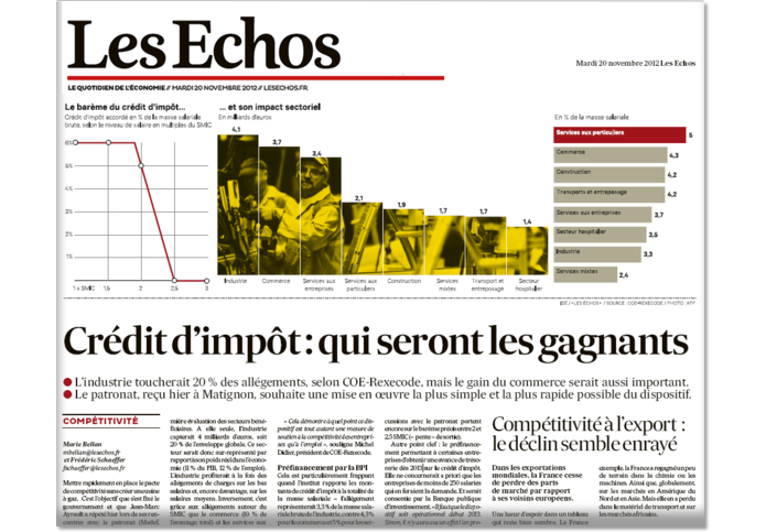 "L'industrie toucherait 20% des allégements, mais le gain du commerce serait aussi important. Le crédit d'impôt ne cible donc pas uniquement les secteurs les plus exposés à la concurrence internationale. "Cela démontre à quel point ce dispositif est tout autant une mesure de soutien à la compétitivité des entreprises qu'à l'emploi", souligne Michel Didier, président de Coe-Rexecode." M. Bellan, F. Schaeffer